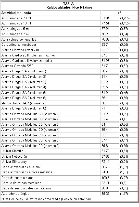 En la tabla I se muestran los resultados de la medición de ruidos aislados con la función del dosímetro «Pico Máximo». No se detectaron en ningún momento ruidos superiores a los 140 dB que marca la ley como límite para establecer medidas de protección de trauma acústico, si bien se aprecian una serie de ruidos de bastante intensidad, correspondientes básicamente a los golpes y caídas de objetos.
