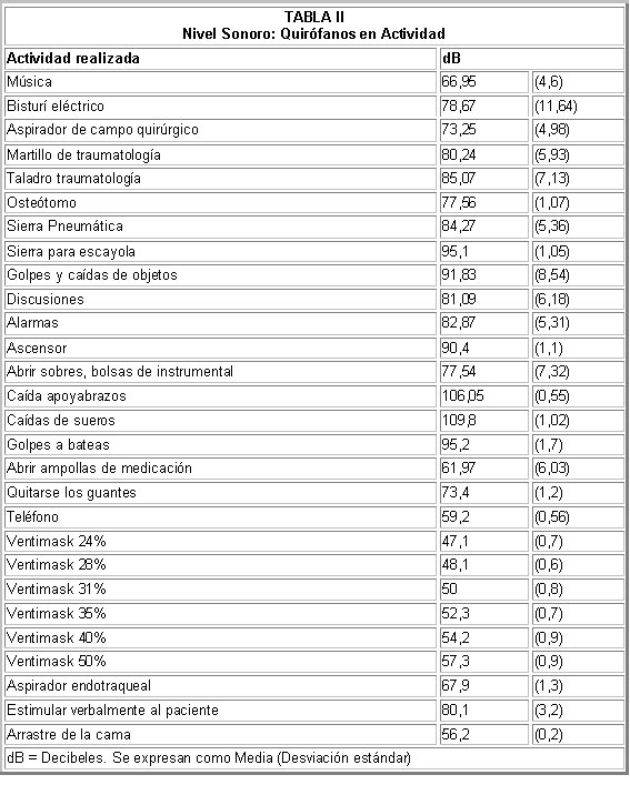 En la tabla II se aprecian los valores obtenidos con la función «Nivel sonoro» del dosímetro, en el curso de intervenciones quirúrgicas habituales, teniendo en cuenta el ruido de base y la sumación de ruidos. Igualmente, no se superó en ningún momento los 140 dB (A) considerados de riesgo laboral por la ley, pero se encuentran ruidos de gran intensidad, protagonizados igualmente por los golpes y caídas de objetos, aunque adquieren importancia también como fuente de ruido intenso los artilugios mecánicos utilizados en traumatología.