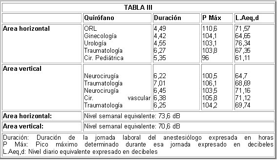 Los Niveles Diarios Equivalentes y los Niveles Semanales Equivalentes para cada una de las Areas Quirúrgicas (horizontal y vertical) aparecen reflejados en la tabla III junto con el P Máx encontrado en cada uno de los quirófanos estudiados. El área horizontal muestra un Nivel Semanal Equivalente de 73,6 dB, bastante superior (recuérdese que la escala de dB es logarítmica) que el encontrado en el área vertical. No se superaron en ninguna de estas áreas los 80 dB. El quirófano con mayor Nivel Diario Equivalente de ruido es el de Urología (76,34 dB).