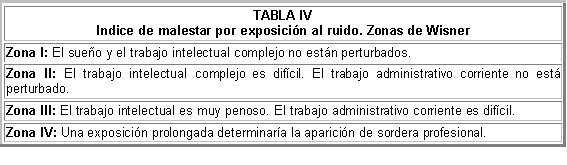 La distribución por octavas de los ruidos que perturban el trabajo del anestesiólogo se representa en la figura 1. Se estudió el Indice de Malestar de Exposición al ruido llevando los valores obtenidos a la escala propuesta por Wisner (tabla IV). Podemos observar que las frecuencias intermedias (200 ~ 1.000 Hz) se sitúan en la zona 2 de Wisner, en tanto que las frecuencias más altas alcanzan la zona 3; esto ocurre de manera paralela en las dos Areas Quirúrgicas.