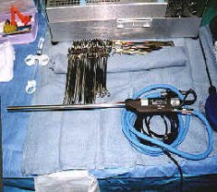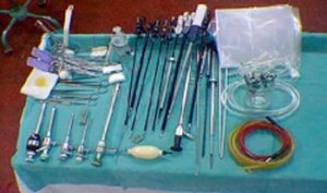 laparoscopio, la fibra óptica, las pinzas, tijeras y Hook (electrobisturí),
